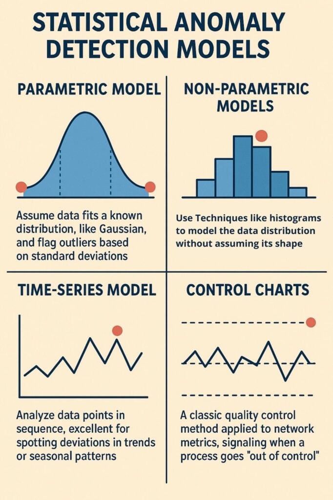 • Control Charts: A classic quality control method applied to network metrics, signaling when a process goes “out of control.”