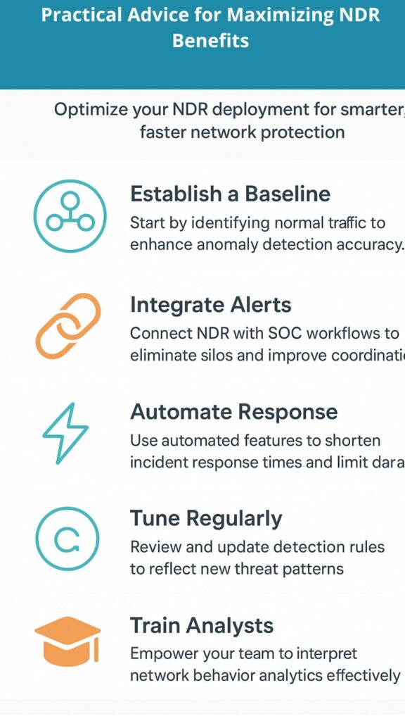 - Integrate NDR alerts with your existing SOC workflows to avoid silos.