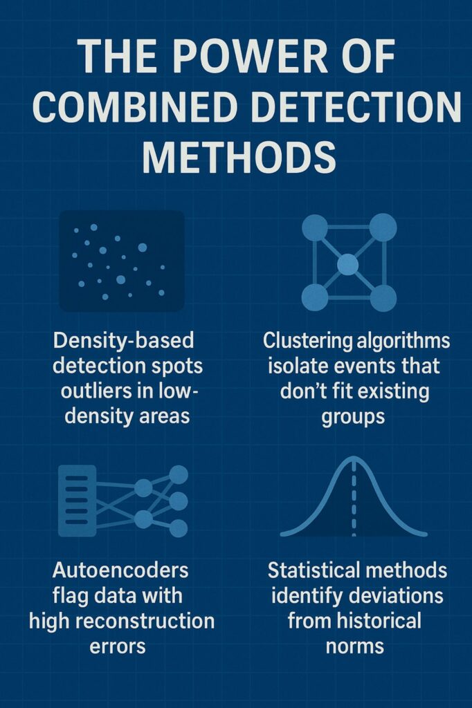 Ensemble learning means using many detection methods at the same time. Different math techniques each have special strengths. One method spots outliers in data clusters. Another groups similar events together.
