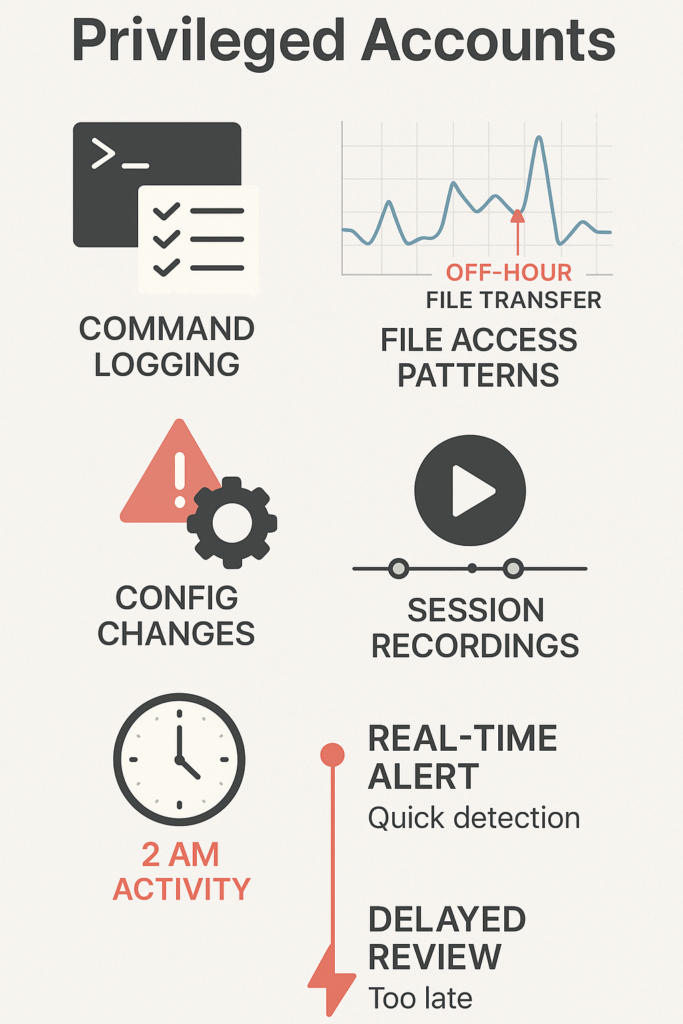 - Watch privileged accounts in real-time – see commands, file changes, and system access as they happen