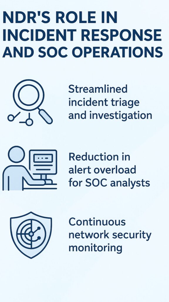 NDR supports incident response by providing enriched forensic data, including session reconstructions and event timelines. This detailed context speeds up investigation and helps responders understand attacker methods and impact.